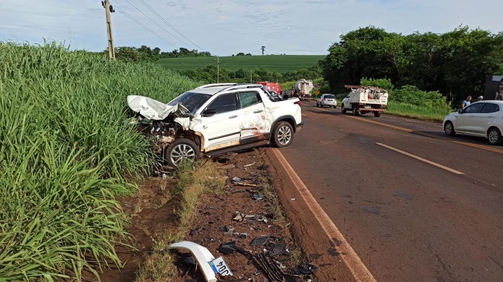 O caminhão câmara fria atingiu o Gol frontalmente e envolveu a Fiat Toro que seguia atrás do Gol.